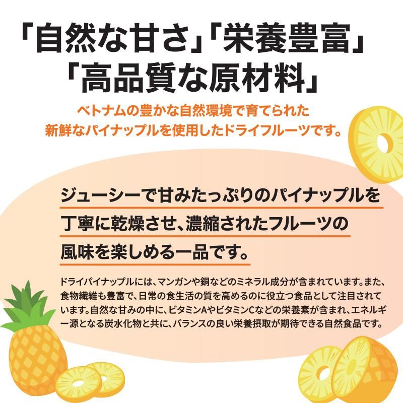 ベトナムの豊かな自然環境で育まれたパイナップルは、特有の甘みと香りを持っています。 このベトナム産パイナップルを丁寧にカットし、低温乾燥させた「ドライパイナップル」は、柔らかくジューシーな食感と濃厚な甘みが特徴です。 栄養面では、生のパイナップルに含まれるビタミンB1、B6、Cなどのビタミン類やマグネシウム、クエン酸、消化酵素ブロメラインが凝縮されており、免疫力向上や美肌効果、疲労回復などの健康効果が期待できます。 特に、ビタミンCは皮膚のコラーゲン形成を促進し、食物繊維は腸内環境を整えます。 そのままおやつとして楽しむだけでなく、ヨーグルトやシリアルのトッピング、お菓子作りの材料としても重宝します。 自然な製法で作られるベトナム産ドライパイナップルは、トロピカルな香りと甘酸っぱさを閉じ込めた、南国の恵みそのものです。